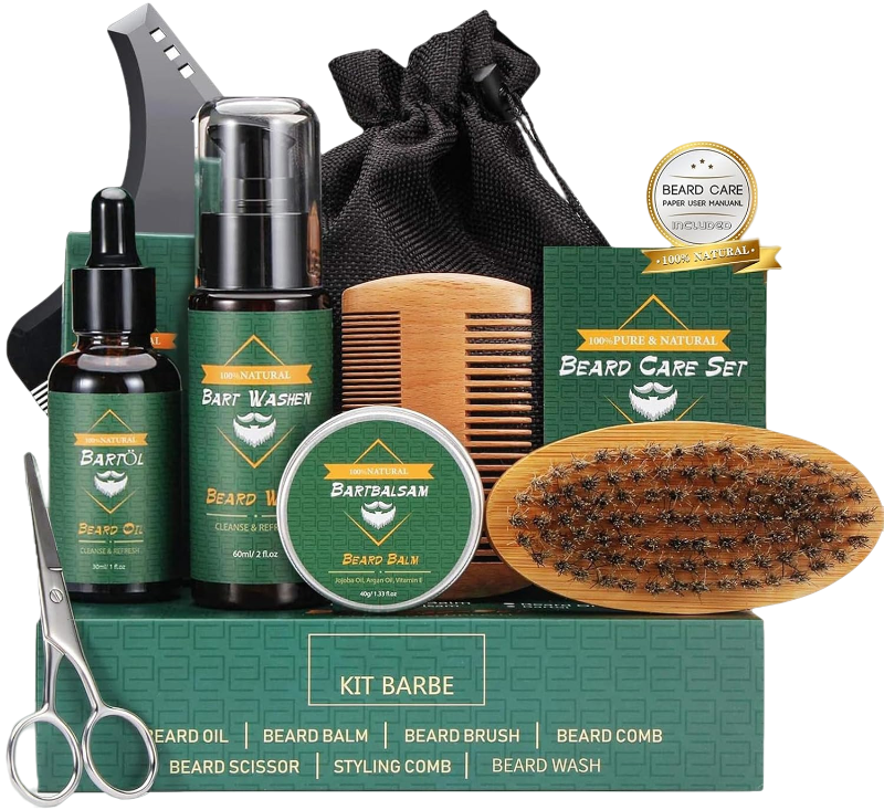 Dentro de la caja de regalo prima hay champú para barba, aceite barba, bálsamo barba, peine, cepillo, tijeras, herramienta para dar forma, bolsa de viaje, ebook de biblia barba. Este es el kit más perfecto y completo que nunca has visto. Este kit es perfecto para todo tipo de barbas o bigotes, largos, cortos, gruesos, delgados, gruesos, enredados.