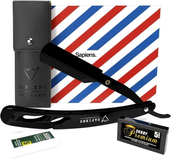 Maquinilla de Afeitar Hombre Profesional para Barba con 10 Cuchillas de Afeitar Derby (20 Cuchillas Simples) y Funda Protectora – Navaja Barbero Negro.