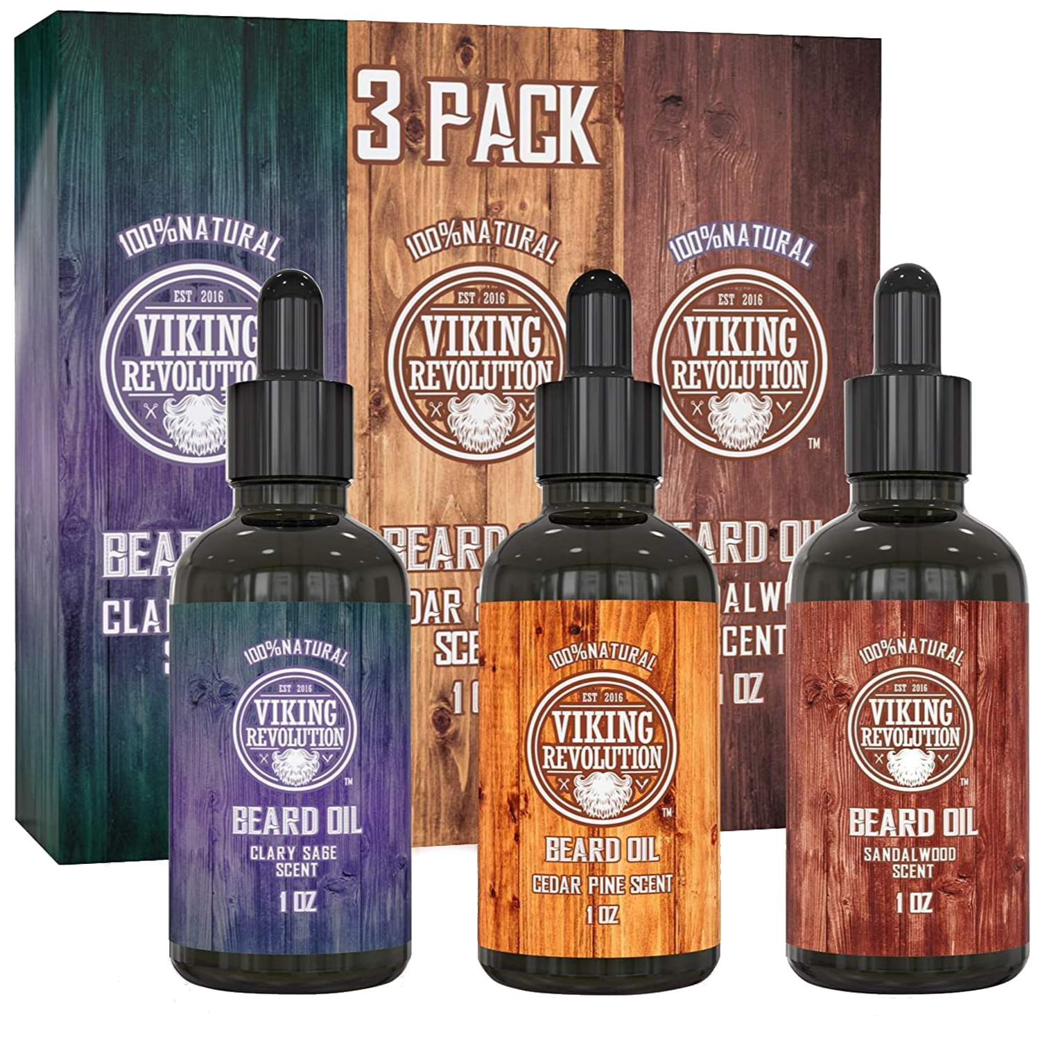 Viking Revolution Aceite Para Barba, Pack De 3 (28g C/u)- Set De Regalo Completamente Natural Aceite Barba Hombre – Aroma A Sándalo, Pino Y Cedro, Salvia – Acondicionador Y Hidratante- Beard Oil